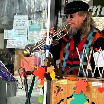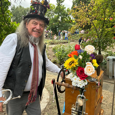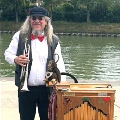Der Straßenmusiker Eckhard Lotto zieht mit seiner Drehorgel, Trompete und weiteren Instrumenten durch Appelhülsen.